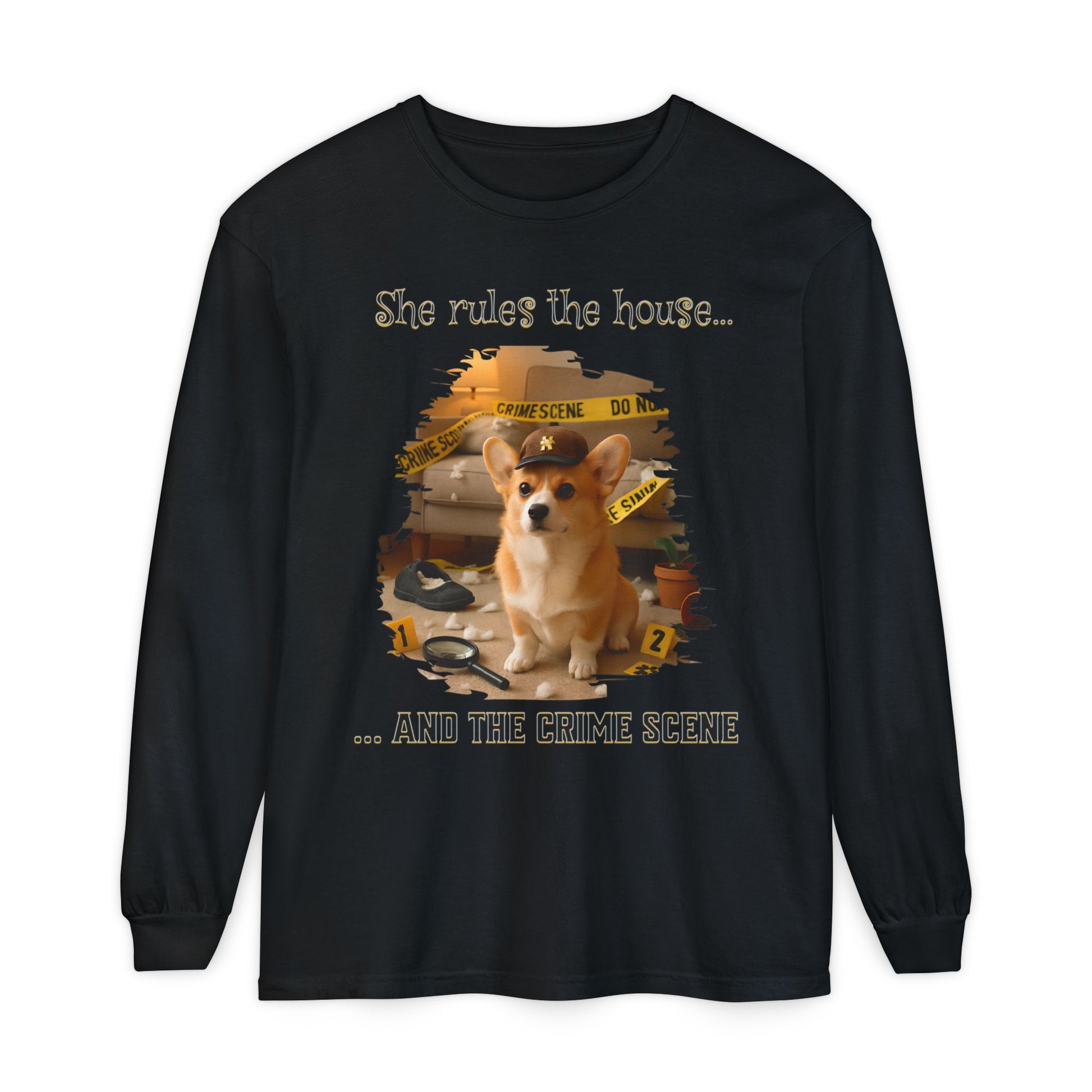 Corgi Crime Scene Unisex Long Sleeve T-Shirt, Funny Dog in Baseball Cap Tee, She Runs The House Apparel, Cute Pet Lover Gift, Casual Cotton