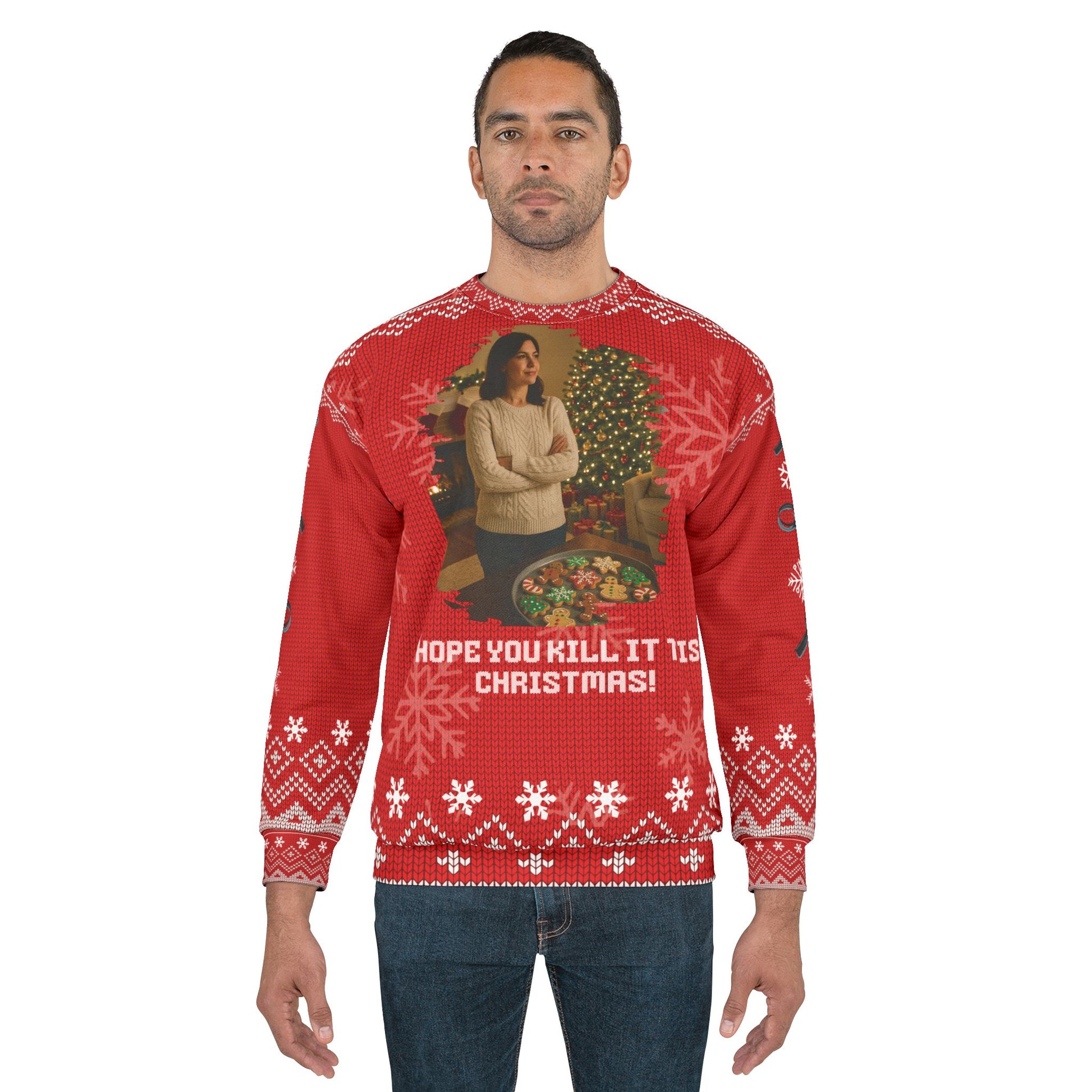 This cozy “Hope You Kill It This Christmas!” sweater features a festive scene: a woman standing proudly over a tray of decorated holiday treats in a warmly lit Christmas setting. Paired with bold red knit-style patterns and playful snowflakes, this sweatshirt blends cozy holiday charm with a cheeky true-crime twist.