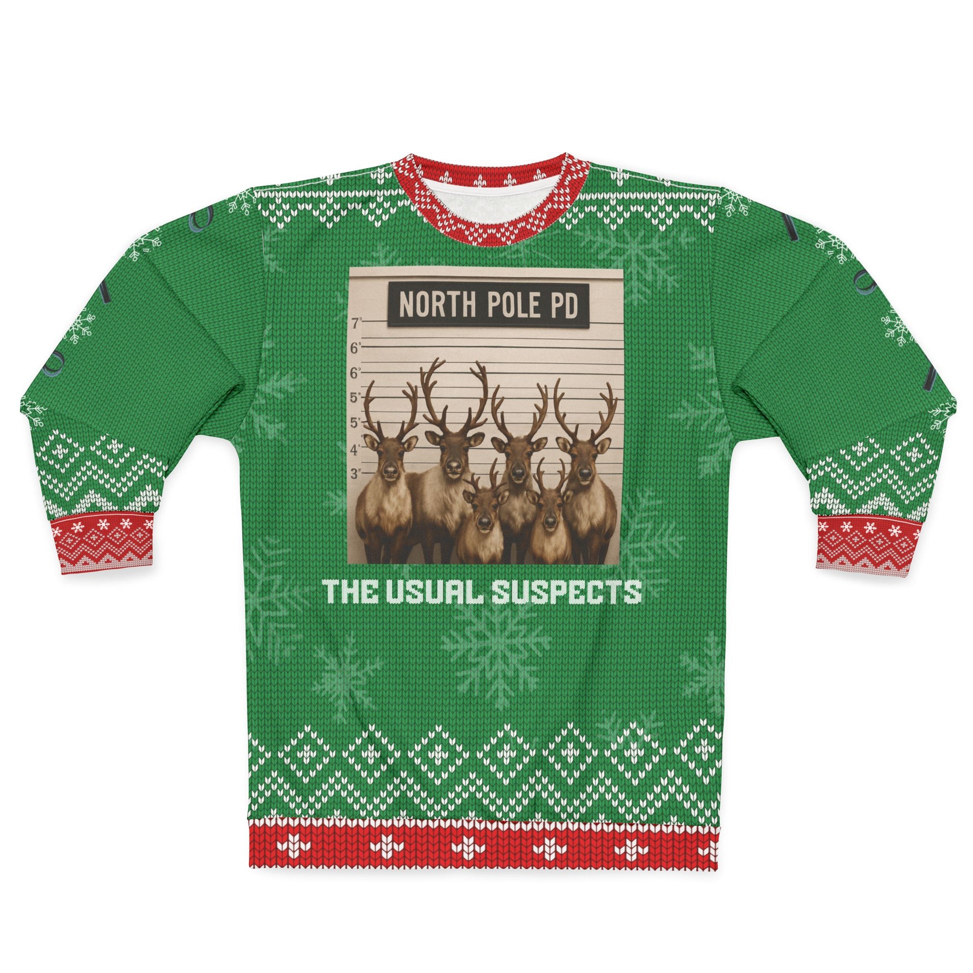 Get ready to crack up the crowd at your next holiday party with this “North Pole PD: The Usual Suspects” Ugly Christmas Sweater!