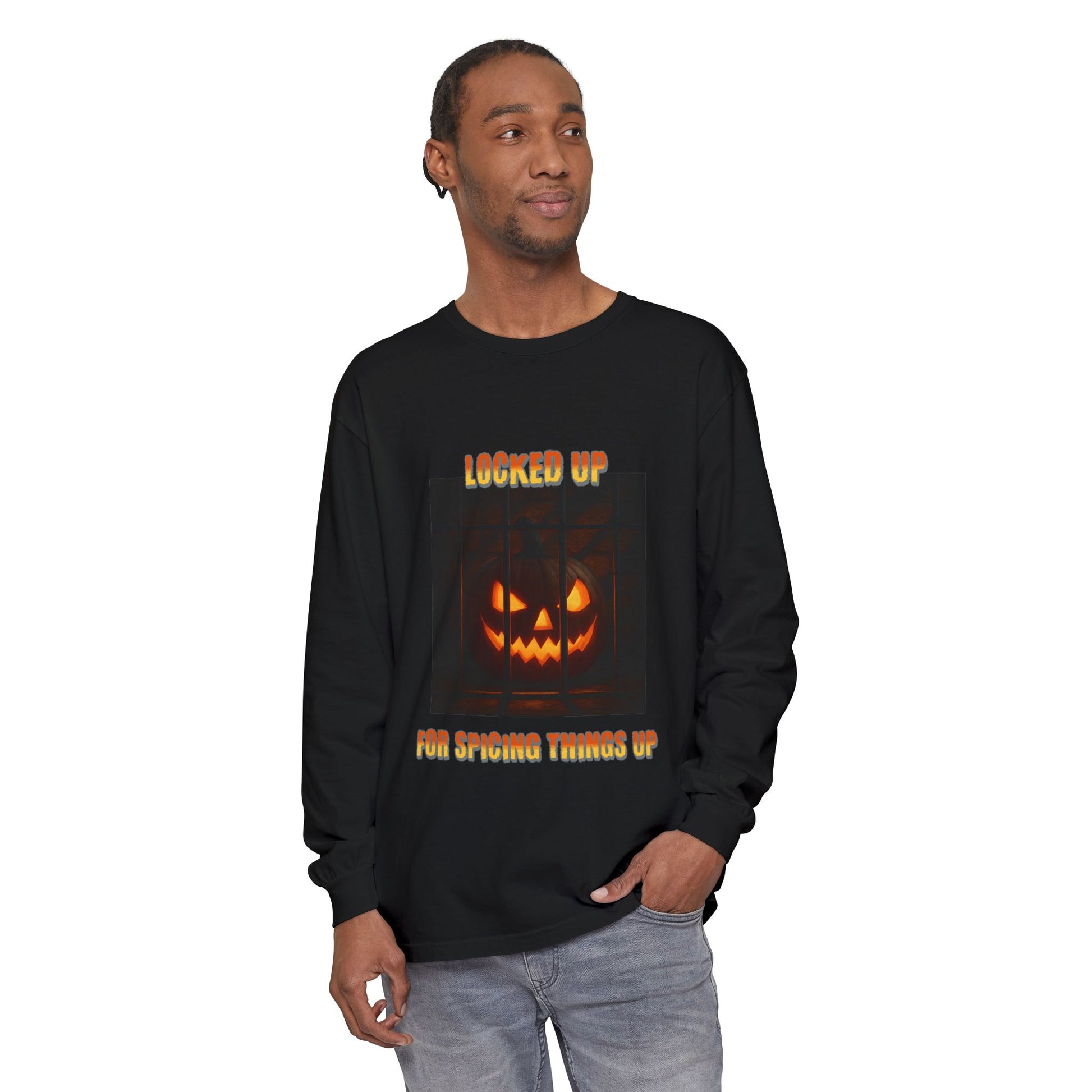 Garment-dyed Long Sleeve T-Shirt with Photorealistic Pumpkin Design, Locked up for Spicing Things Up, Halloween Shirt, Fall Tshirt, Orange