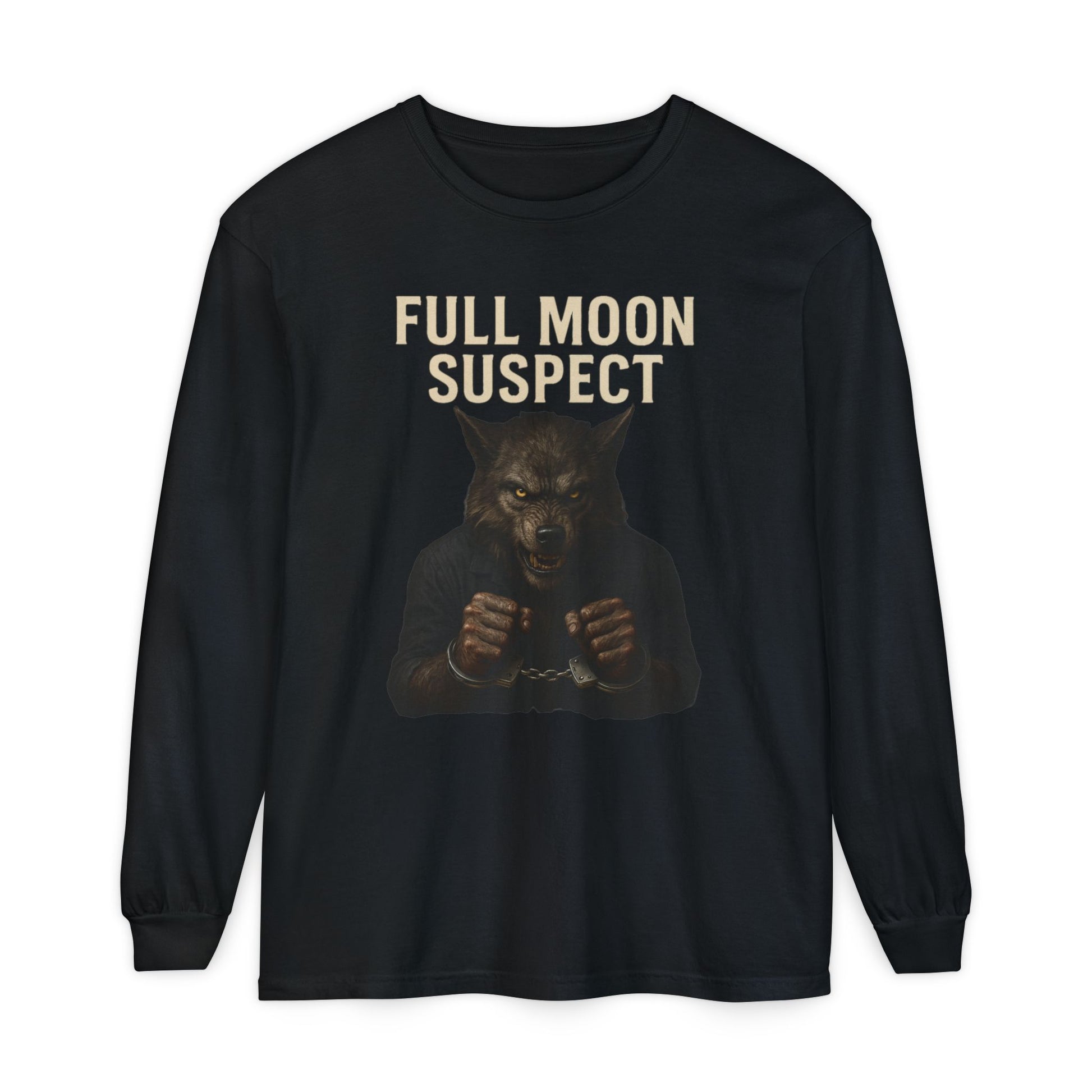 This Halloween Long Sleeve Tee features a fun werewolf design in handcuffs, perfect for crime show lovers. The tagline 'Full Moon Suspect' adds to the intrigue. This shirt gives off a spooky and mysterious vibe, ideal for Halloween celebrations. It is relevant to adults who enjoy unique and themed clothing.