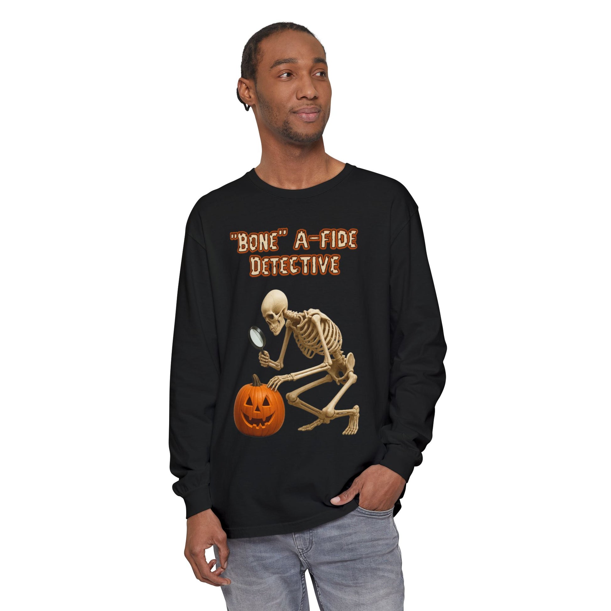 Long Sleeve T-Shirt Bone-a-fide Detective Halloween Skeleton Design